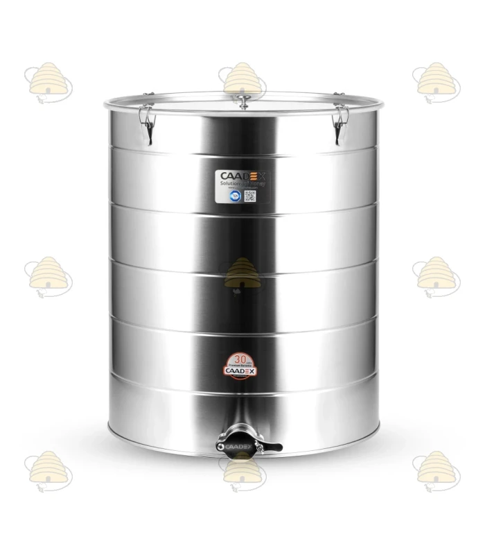 Premium RVS aftapvat van het merk CAADEX, voorzien van een deksel, siliconen afdichting, 2 handvatten, een RVS snijkraan, en 4 klemmen om het deksel luchtdicht af te sluiten op het vat. Dit vat / deze rijper heeft ruimte voor 131 L wat overeenkomt met 180 KG honing. Een zeer degelijk vat voor het opslaan en afvullen van honing.