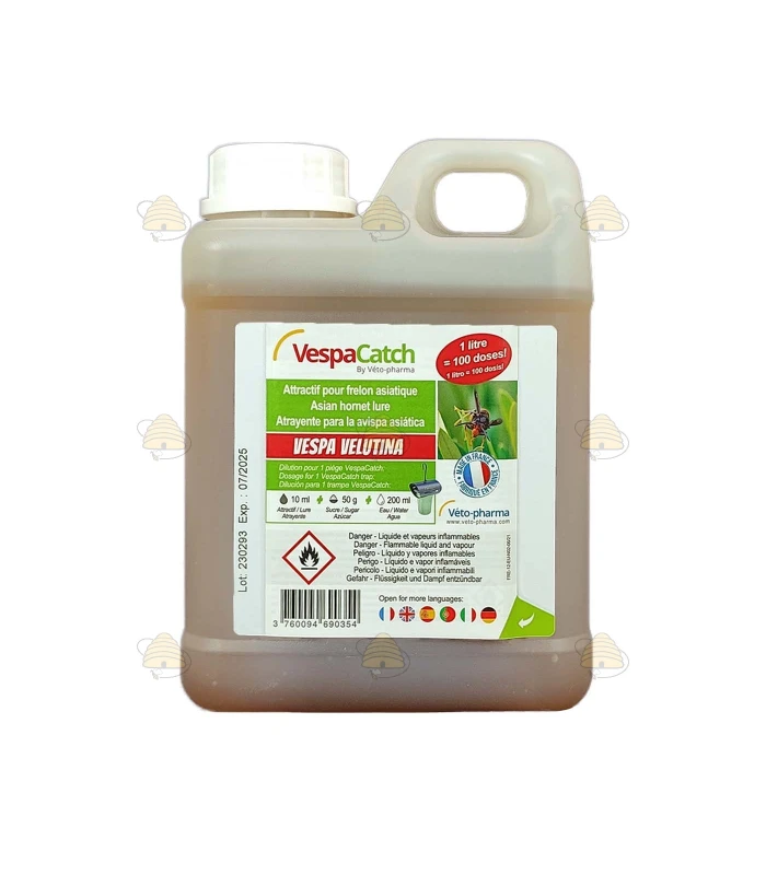 VespaCatch lokvloeistof in een handige 1 liter jerrycan is een op planten gebaseerd lokmiddel dat specifiek is ontworpen om geen bijen aan te trekken, waardoor de vangst van Aziatische hoornaars wordt gemaximaliseerd. Het wordt geleverd in een 1L kan met maatbekertje in de dop.