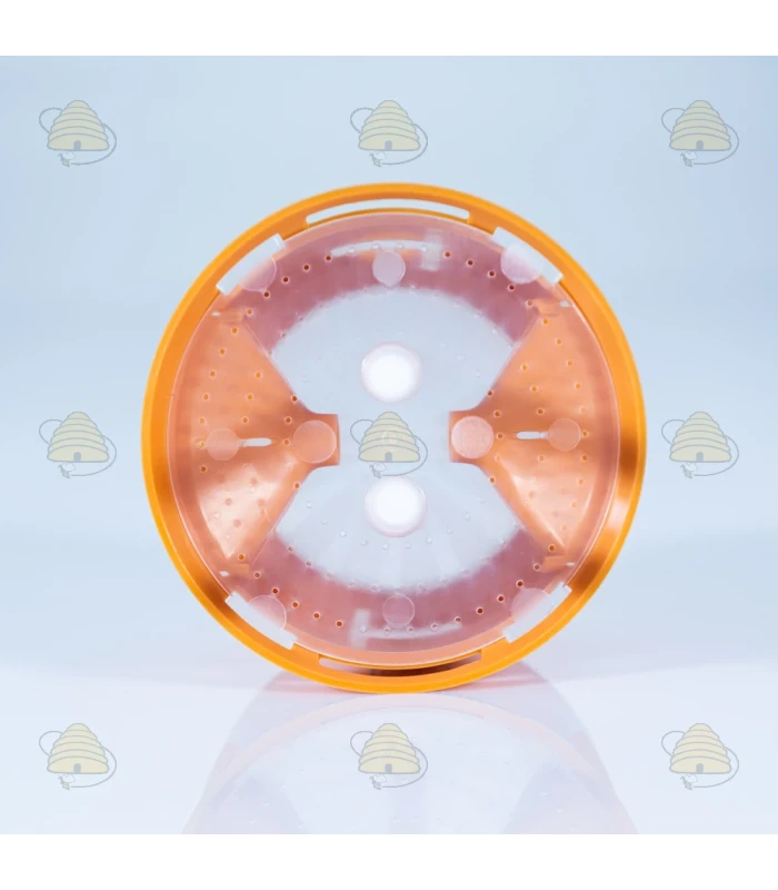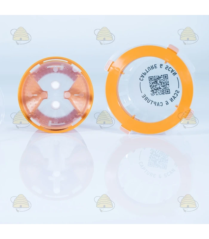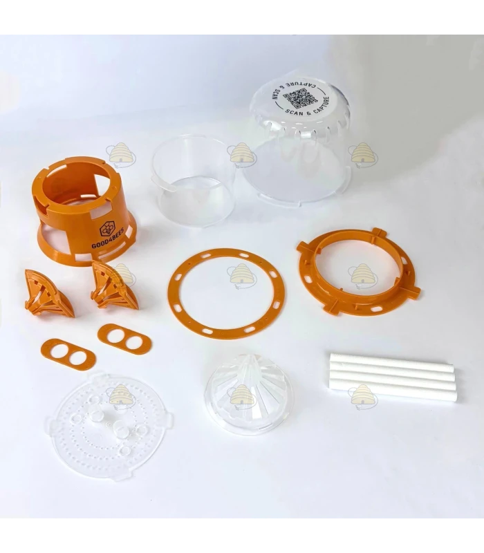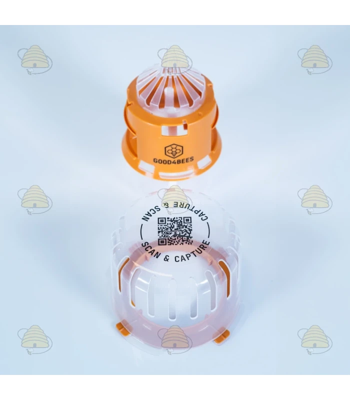 De openingen in het transparante bovendeel zijn precies afgestemd: klein genoeg om te voorkomen dat de Aziatische hoornaar ontsnapt, maar groot genoeg om andere insecten de kans te geven vrij weg te vliegen.