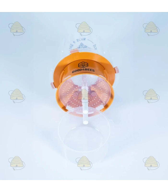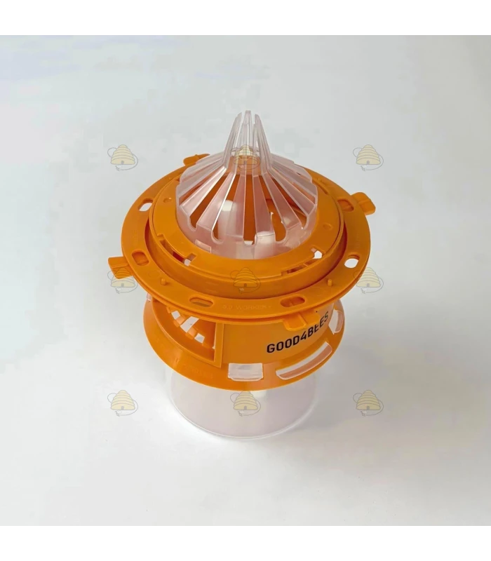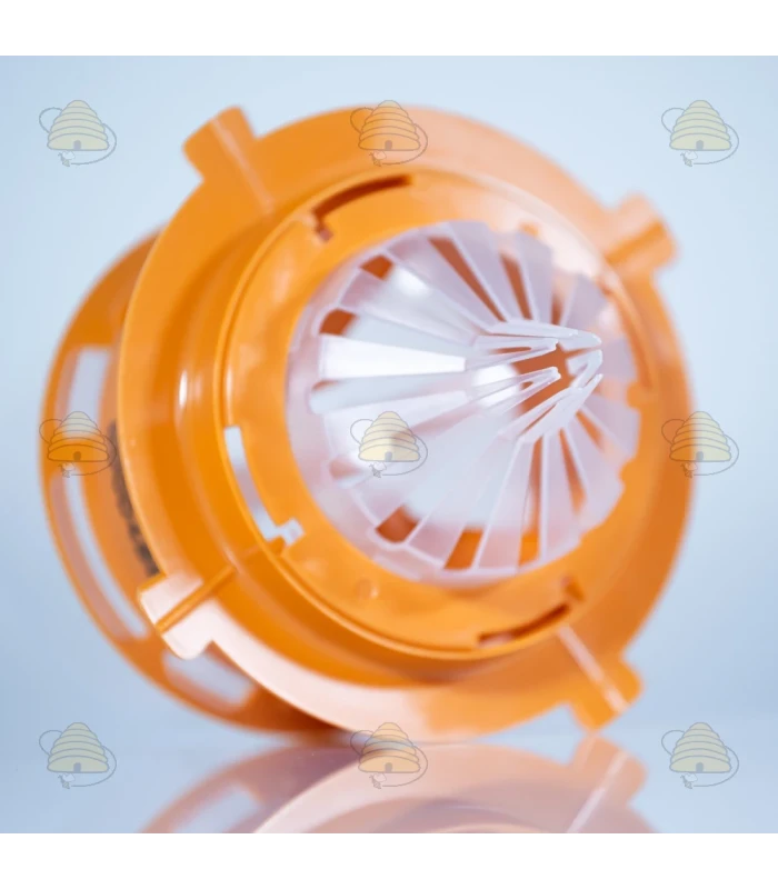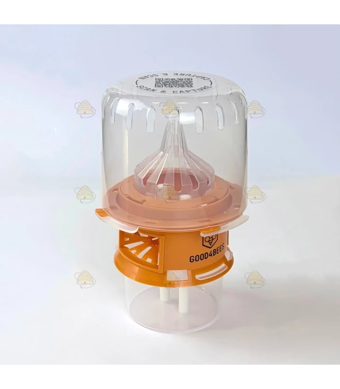 Aan de zijkant van de val wordt de hoornaar naar binnen geleid. Zodra hij de val binnenvliegt, wordt hij automatisch aangetrokken door het licht dat door de transparante bovenkant binnenvalt. Via de kegelvormige doorgang vliegt hij naar het bovenste compartiment van de val.