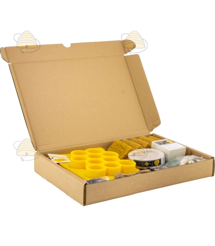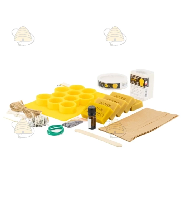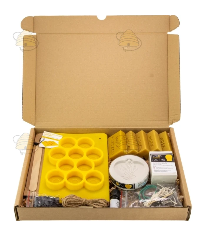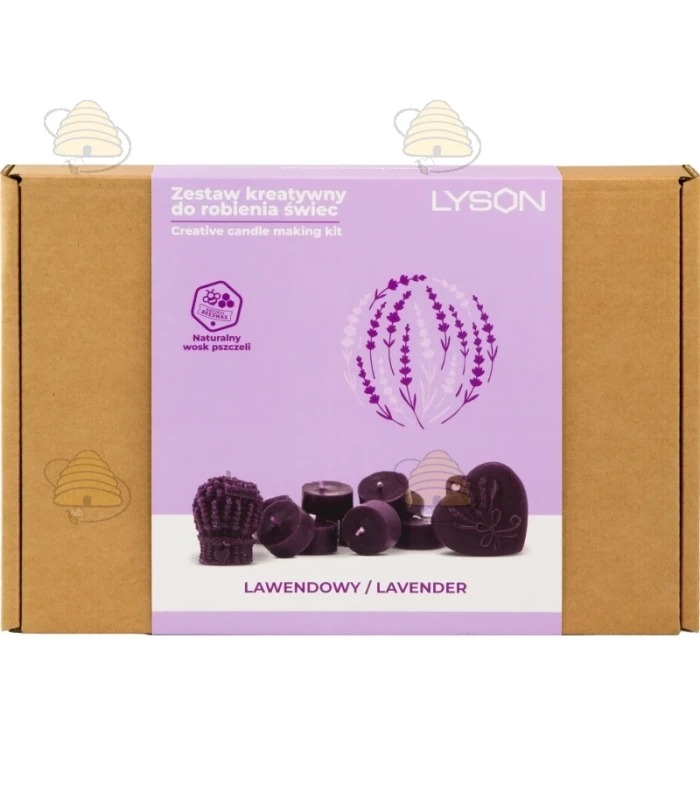 Creatief pakket voor het maken van bijenwas kaarsen. Deze set bevat 5 blokjes van 50 gram bijenwas, drie gietvormen (lavendel struik, hanger met lavendel en een matje voor het maken van 10 ronde kaarsen), lavendel geurstof 5 ml, paarse kleurstof 5 gr en waxine lontjes, lont en elastieken.