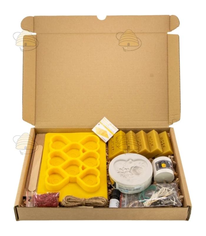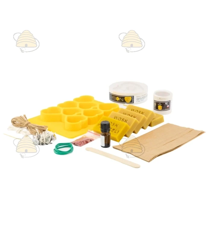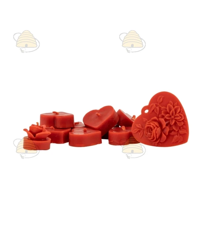 Creatief pakket voor het maken van bijenwas kaarsen. Deze set bevat 5 blokjes van 50 gram bijenwas, drie gietvormen (waxinelicht roosje, hanger met rozen en een matje voor het maken van 8 hartvormige kaarsjes), rozen geurstof 5 ml, rode kleurstof 5 gr en waxine lontjes, lont en elastieken.