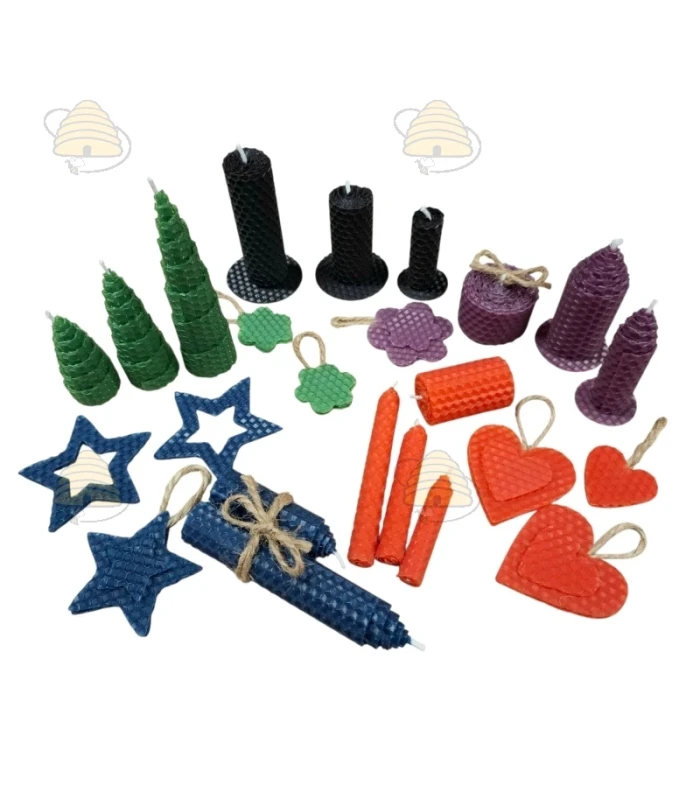Creatief pakket om zelf kleurrijke kaarsen te rollen en hangers te maken. Maak unieke kaarsen zonder dat je bijenwas hoeft te smelten. Het pakket bestaat uit 5 kleuren bijenraat vellen van 205 x 335 mm, klosjes lont en 12 stansmallen.