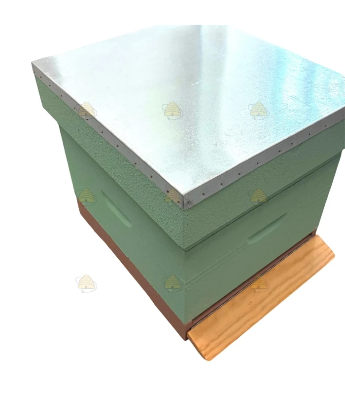 Mintgroen geverfde Spaarkast bijenkast (Simplex raammaat), bestaande uit een dak, honingkamer, broedkamer en een bodem. Het dak is voorzien van een gegalvaniseerde dakbedekking en de bodem is voorzien van RVS bodemgaas en een uitschuifbare varroalade.