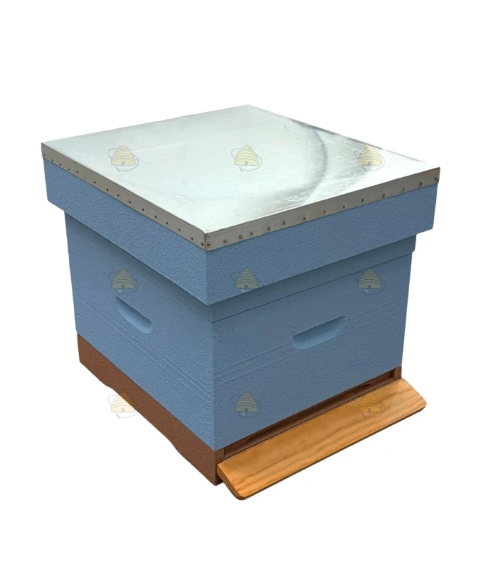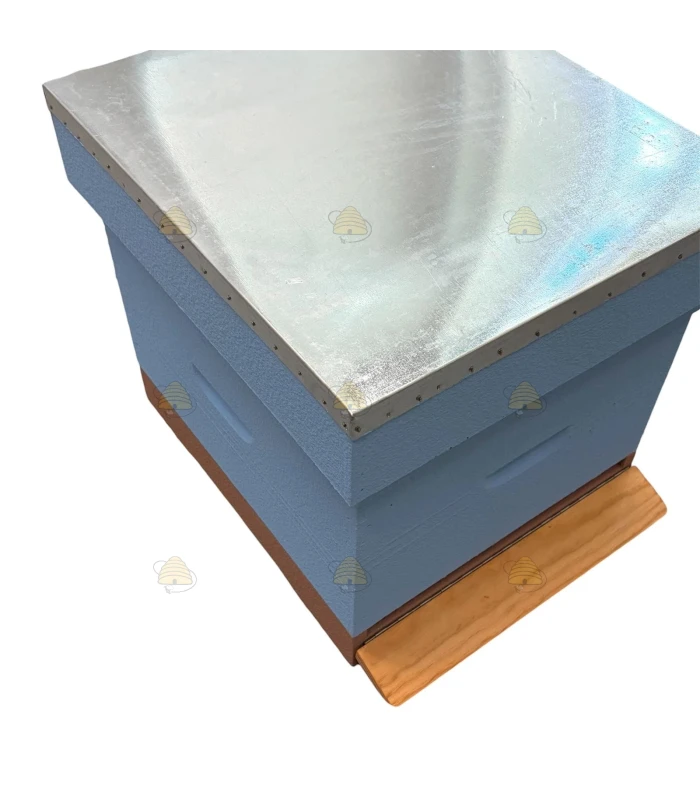 Lichtblauw geverfde Spaarkast bijenkast (Simplex raammaat), bestaande uit een dak, honingkamer, broedkamer en een bodem. Het dak is voorzien van een gegalvaniseerde dakbedekking en de bodem is voorzien van RVS bodemgaas en een uitschuifbare varroalade.