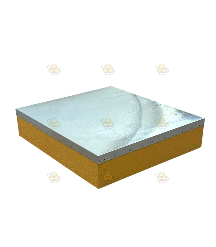 Geverfd dak voor de Spaarkast bijenkast (Simplex raammaat). Het dak is gemaakt van grenen en is zandgeverfd in de kleur lichtgeel. De dakbedekking is gemaakt van gegalvaniseerd metaal.
