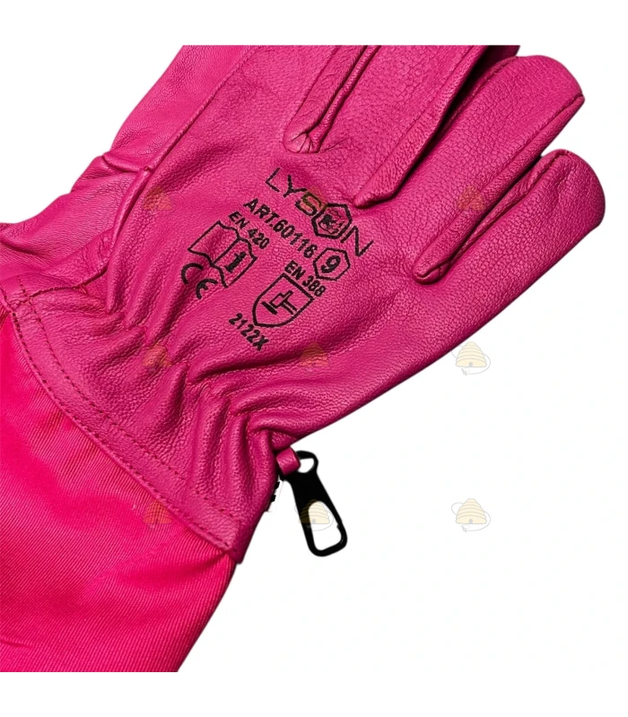 Handschoenen, speciaal voor de imker. Gemaakt van soepel geitenleer met lange mouw van stevig katoen. Verkrijgbaar in een leuke roze kleur.