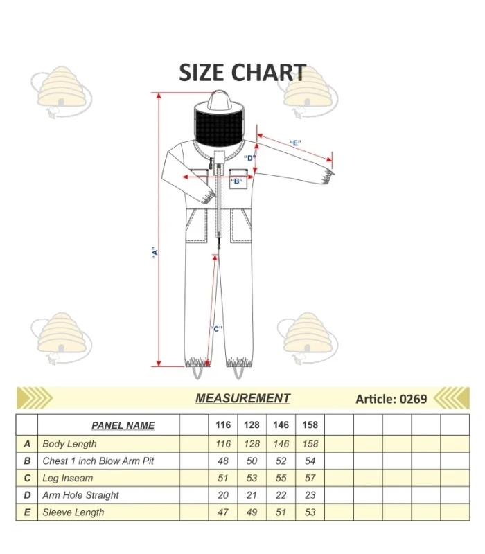 Kinder imkeroverall met ronde hoed, gemaakt van dun dicht geweven katoen. Voorzien van  een rits een aan de voorzijde van de overall en een aan de kap. De overall wordt geleverd in de kleur wit. Verkrijgbaar in de maten: 116, 128, 146 en 158 (selecteer maat).
