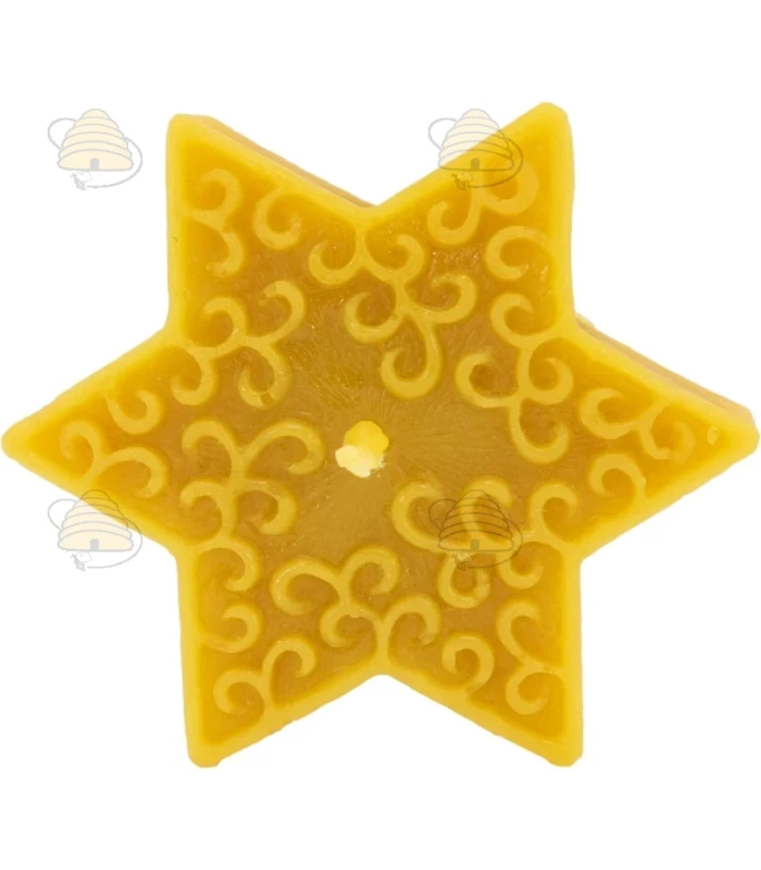 Gietvorm van een ster, voorzien van versiering. Deze gietvorm is 1,8 cm hoog en 6,8 cm breed.