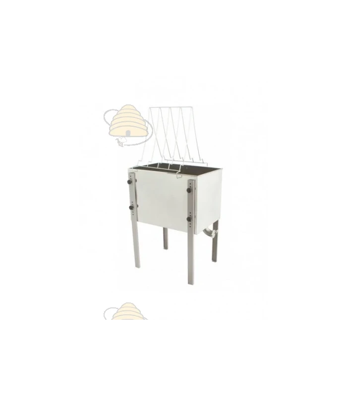 Ontzegeltafel, geheel gemaakt van RVS, met een breedte van 500 mm en een diepte van 400 mm. De tafel heeft een vlakke bodem, een kraan en is voorzien van een stelling waar de ramen voor het ontzegelen op geplaatst kunnen worden. Om trilling te voorkomen staat de tafel op rubberen voetjes. Een handig en degelijk apparaat.