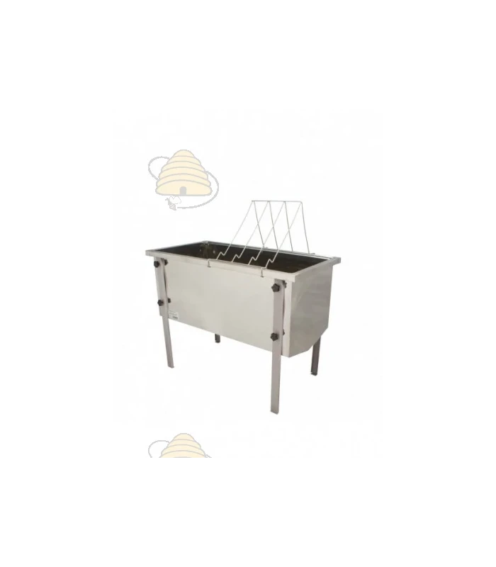 Ontzegeltafel, geheel gemaakt van RVS, met een breedte van 750 mm. Dit maakt de tafel uiterst geschikt voor Dadant ramen. De tafel heeft een trapeziumvormige bodem voorzien van kraan, een zeef en is voorzien van een stelling waar de ramen voor het ontzegelen op geplaatst kunnen worden. De tafel kan daarnaast ook op hoogte ingesteld worden. Om trilling te voorkomen staat de tafel op rubberen voetjes. Een handig en degelijk apparaat.