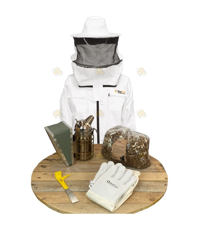 Starterspakket bijenhouden, voorzien van alle essentials die nodig zijn bij het houden van bijen. Dit pakket bestaat uit een wit imkerjack, witte imkerhandschoenen, een beroker, tabak en een kastbeitel. Zo kan je direct aan de slag in je bijenkast, omdat je voorzien bent van de basisbenodigdheden bij het imkeren.