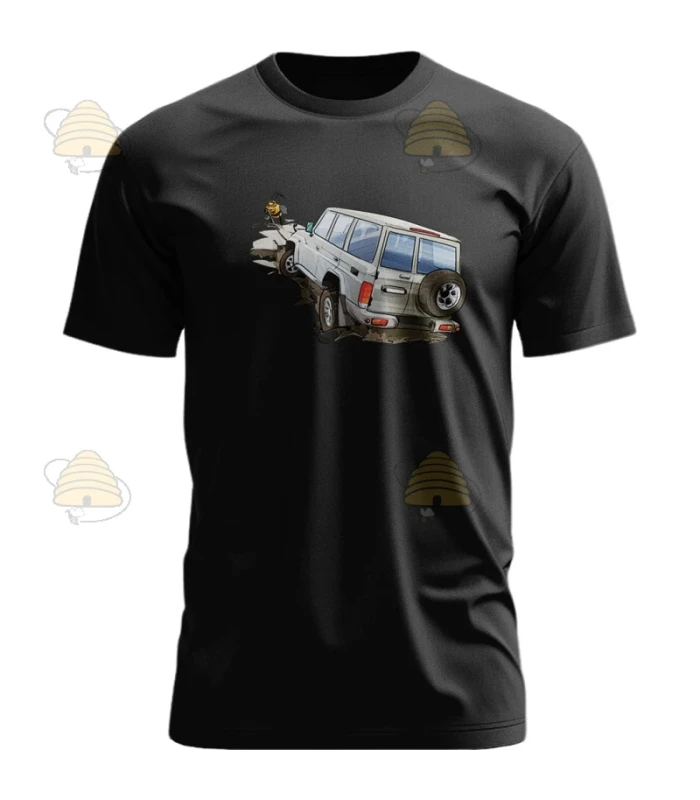 T-shirt met een afbeelding van een Toyota SUV die vast zit in de modder. Een sterke bij trekt de SUV uit de modder!