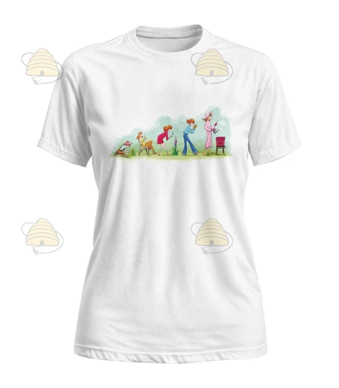 T-shirt met een afbeelding van een vrouwelijke imker haar eerste lepel honing tot haar eigen bijenkast.