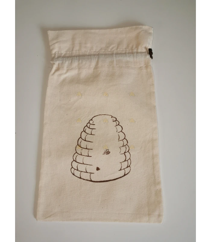 Tasje van ongebleekt katoen met een leuke print erop van een korfje. Ideaal om een honingpot in cadeau te doen of gewoon leuk om imkermateriaal in te bewaren. Ook verkrijgbaar met andere opdrukken. Hoogte van het tasje is ongeveer 27,5 cm en de breedte is ongeveer 16 cm.