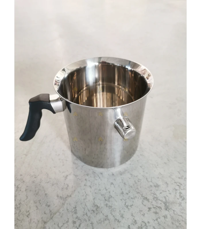 Een van onze mooiste smeltpannen voor was uit het assortiment. Deze dubbelwandige smelt-/gietpan, met deksel, is erg degelijk en gemaakt van roestvrij staal (RVS). Ideaal om bijenwas in te smelten door zijn dubbele wand die gevuld wordt met water. Hierdoor wordt de was 'au bain Marie' verwarmt. De gesmolten was kan daarna met deze was smelt-/gietpan in een vorm gegoten worden of er kunnen kaarsen uit getrokken worden. Ook kan de was overgegoten worden in een klein, handig, gietkannetje. De binnenzijde pan is 14 cm hoog en heeft een inwendige diameter van 13,5 cm en uitwendig van 16 cm (zonder handvat). De inhoud is ruim 1,5 liter. Tot de rand gevuld: 1750 ml. Voordeel van de RVS pan ten opzichte van een aluminium pan is dat RVS niet met bijenwas en voedsel reageert. De smeltpan werkt ook op een inductie kookplaat en uit veiligheidsoogpunt adviseren wij de pan te gebruiken op een elektrische kookplaat (geen open vuur).