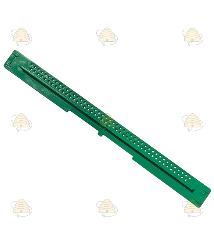 Groene kunststof vlieggatstrip voor de Nicot bodem. Met deze strip kan je eenvoudig de bijenkast afsluiten of de opening verkleinen. Door de grootte van de vliegopeningen van 5,5 mm zullen de meeste hoornaars geweerd worden. De hoogte is 3,7 cm en de lengte 41,7 cm (past precies op de Nicot bodem).