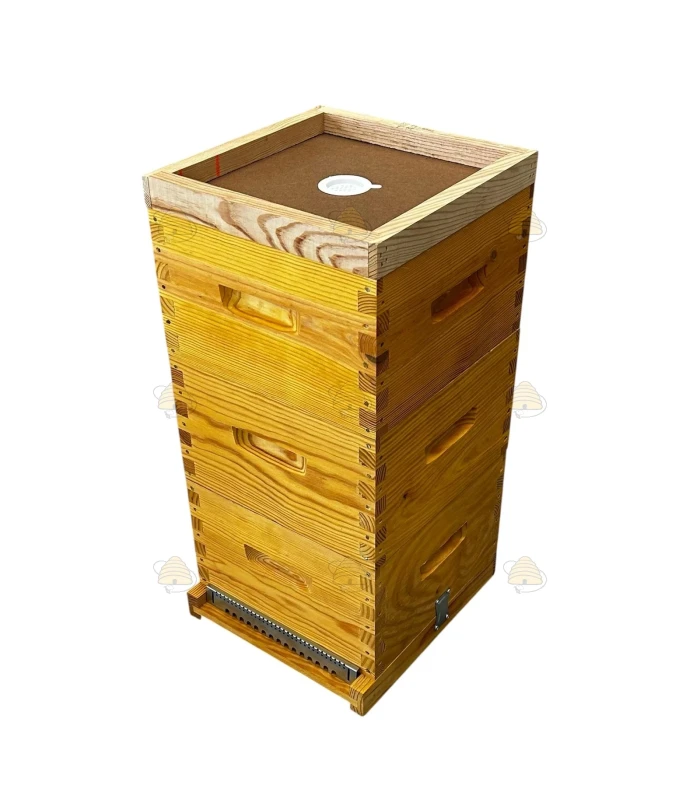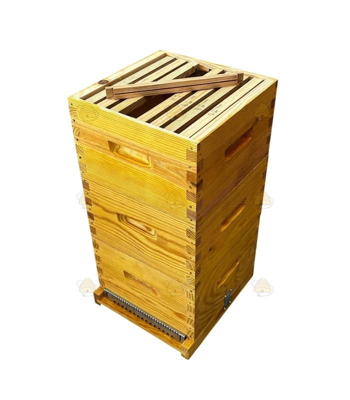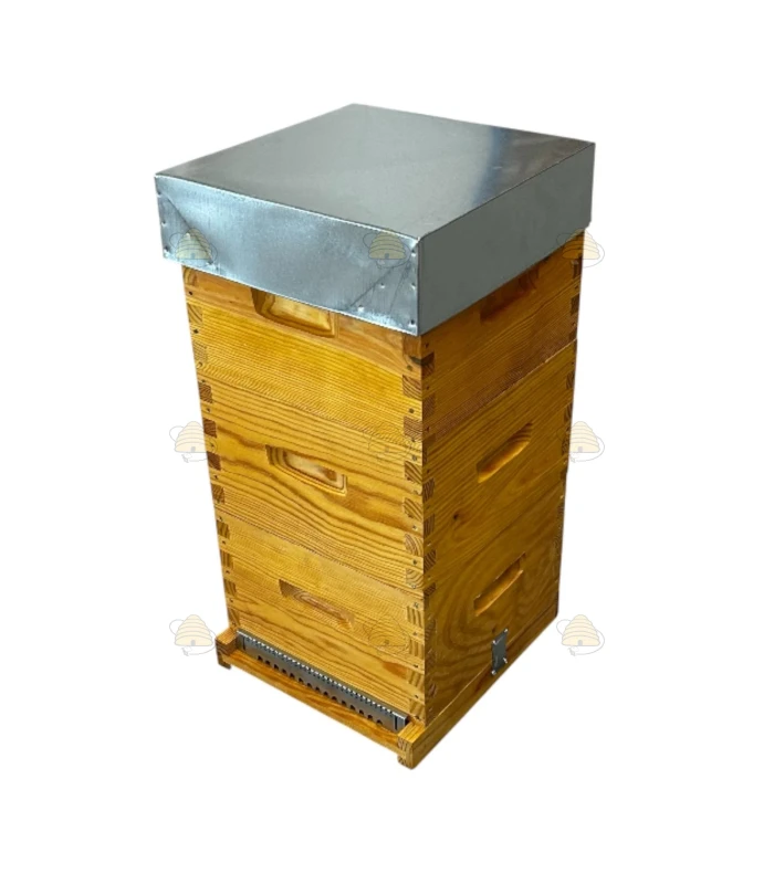 Warré grenen bijenkast, compleet geleverd en reeds geïmpregneerd met lijnzaadolie. De bijenkast bestaat uit een houten bodem, 3x 8-raams broedkamer, 3x broedkamer toplatten (8 stuks), afstandstrips, dekplank, dak en een vlieggatschuif.