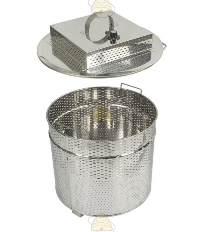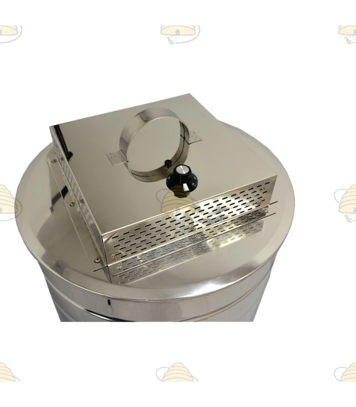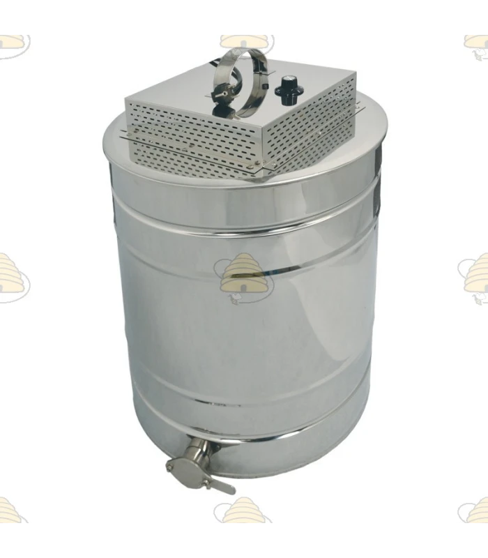 Heteluchtverwarmer die de lucht opwarmt van 30 tot maximaal 120 graden. De smelter is bruikbaar om honing te dékristalliseren in emmers of in ramen. Werd vroeger ook gebruikt om was te smelten maar dat raden wij af. De fabrikant geeft wel aan dat dit kan (zorg er dan wel voor dat de warme lucht goed tussen de ramen kan, dus niet té vol zetten).  Er passen eventueel 19 broedkamer ramen of 28 honingkamer ramen in en van Dadant Blatt ongeveer 11. De smelter is gemaakt van RVS staal van 0,8 mm dik. Het ronde vat is voorzien van handgrepen, het vermogen is 2kW. De hoogte van het binnenvat is 42 cm en de diameter is 45 cm. Als je de ramen iets buiten de mand laat steken is de maximale hoogte 57 cm. Buiten diameter van het vat is ongeveer 500 mm.