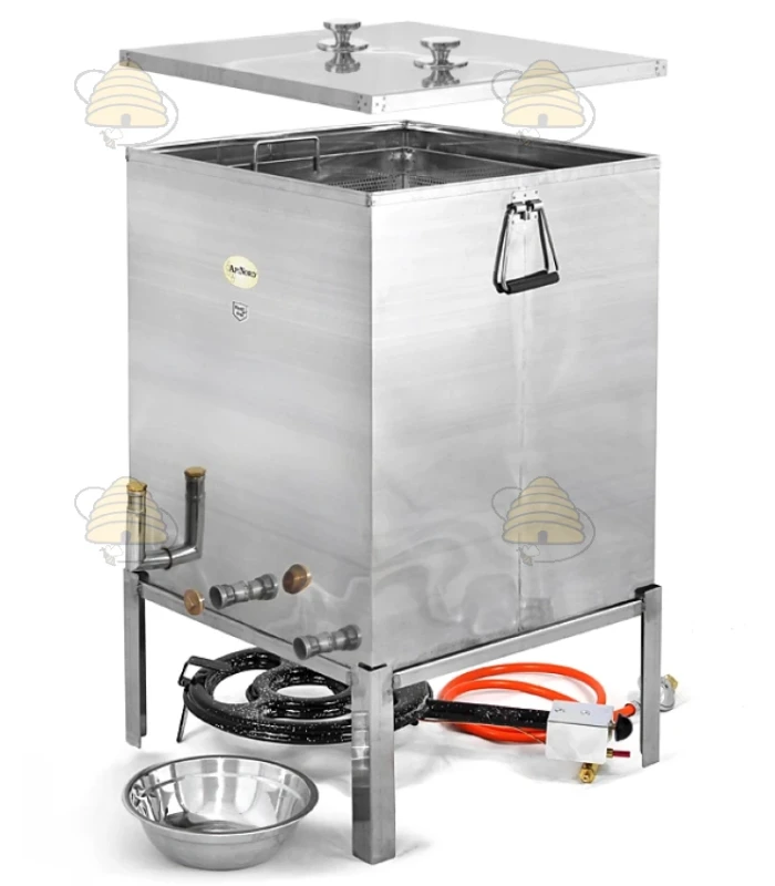 Stoomwassmelter, gemaakt van RVS, in een rechthoekige vorm. Deze stoomwassmelter is voorzien van een los standaarden is daardoor eenvoudig te plaatsen. In deze wassmelter passen zo'n 18 Simplex honingkamer ramen. De wassmelter is 66 x 41 cm met pijpjes en met een hoogte van 65 cm. De wassmelter wordt geleverd in combinatie met een gasbrander.